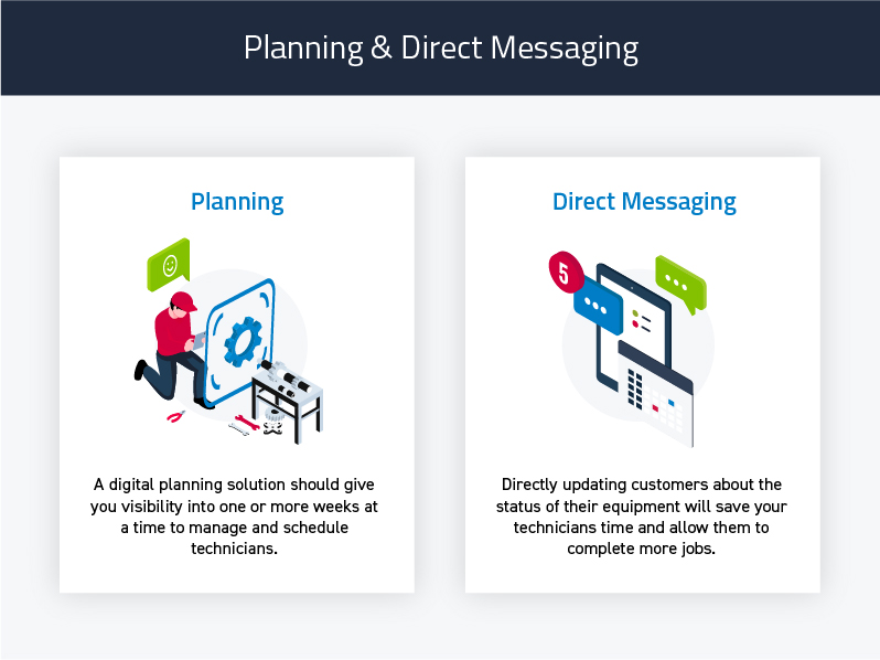 Direct messaging is probably the most important tool your dealership needs to consider when looking to undertake a digital transformation of its service department. Imagine a world where service employees aren’t taking or making phone calls all day long, dealing with the salesman who wants to know what’s going on with the service work order, or dealing with someone who’s dropping off a piece of equipment and waiting for a technician to discuss some information with them. Having a tool that can directly update customers about the status of their equipment will save your technicians time and allow your service department to complete more work.