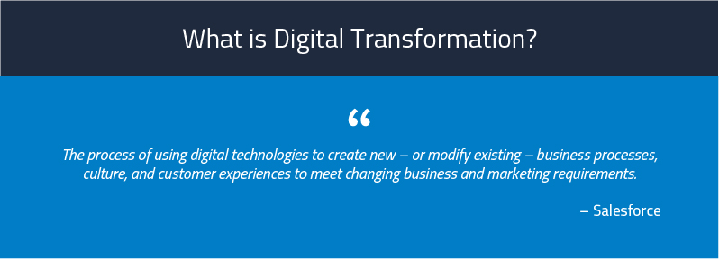 “The process of using digital technologies to create new – or modify existing – business processes, culture, and customer experiences to meet changing business and marketing requirements.”